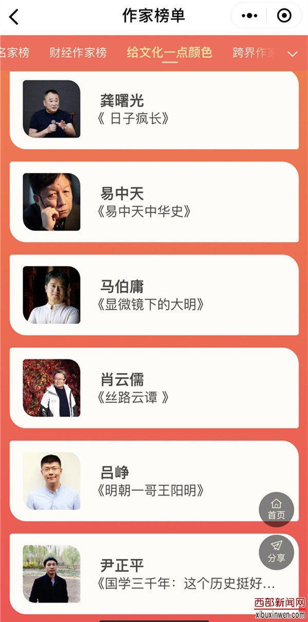 这次评选是从上千名候选作家中由网络投票选出的。上榜作家的作品都在广大读者中产生了较大影响力,并有较大发行量。肖云儒老师的《丝路云谭》是这位年近八旬的老人最近几年连续三次坐汽车跑三条丝路之后,所写“丝路三部曲”(《丝路云履》《丝路云谭》《丝路云笺》)中的一本,江西教育出版社出版后,多次增印,并获得第八届“冰心散文奖”榜首和中宣部对外推介优秀图书的荣誉。