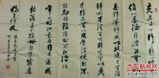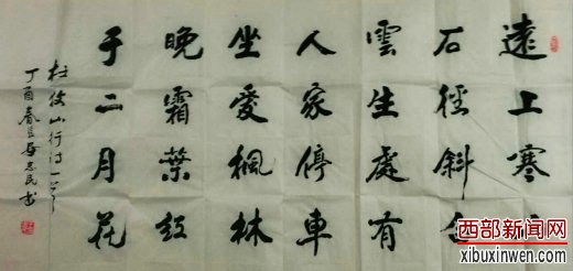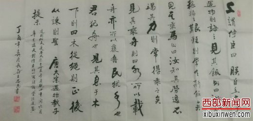 书法之道,其道益深,其修弥远。从王老师作品中看到的不仅是书写汉字的法度,更重要的是他那颇具时代气息的意境追求。在浮躁的红尘中,他以一颗宁静安详的心,在一方宣纸之上尽情挥洒,恣意笔耕,书写着点画结构交织而成的艺术语言,心灵得到满足和愉悦,人生在墨香中得到静悟与升华。王忠民是一位非常有悟性的书法家。作品中表现出的内涵和特有气质,往往给人惊喜和震撼。王忠民还是一位很有社会责任感的书法家,他经常参加社会公益活动,还每年为群众义务写春联等。这正是作为一名书法家扎根现实生活,真诚前行的印证。