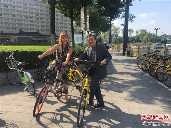 她提的问题很广泛,似乎除了丝绸之路和解读陕西、西安,还想了解一位中国学者的人生道路和家庭、事业方方面面,这样,原定半小时的采访延长到一个半小时。采访结束,又拉上我到西安的标志性景观南门广场,以西安城楼为背景,在专门说了一段简介西安城的话。她说要作为西安专题片的开头用。之后,还“绑架”我和她作了一次秀,两人并肩骑上了西安的共享单车。照片传到微信上,有朋友调侃我:能被金发美女“绑架”,好羡慕呀!