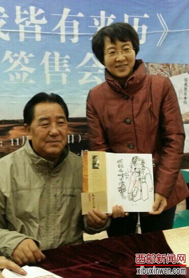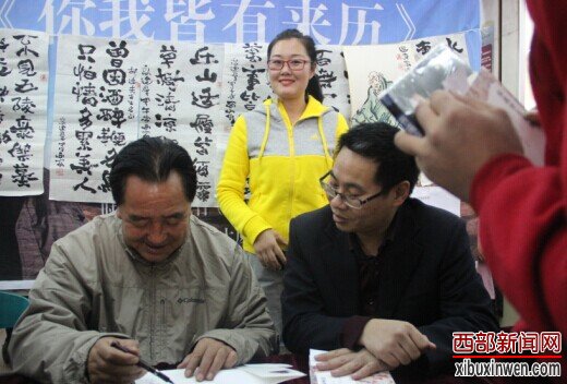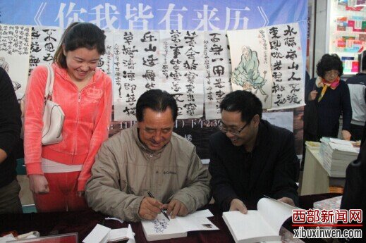 著名作家高建群在新作《你我皆有来历》签售会上讲话 西部新闻网总编张龙陪同