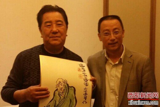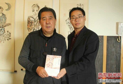 著名作家高建群在“高看一眼工作室”为西部新闻网总编张龙签名赠书