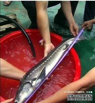 此时,正在都昌县水域巡湖的江西省鄱阳湖渔政局专家听说中华鲟误入渔网,也赶了过来。经测量,此条中华鲟长97厘米,有40节肋骨,围长34厘米,重约5公斤。