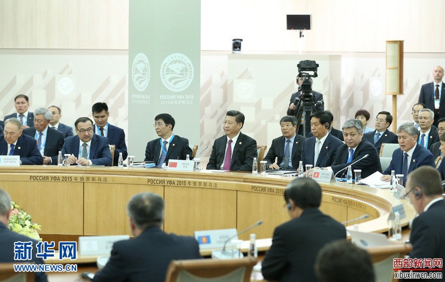 图为:2015年7月10日,上海合作组织成员国元首理事会第十五次会议在俄罗斯乌法举行。国家主席习近平出席会议并发表重要讲话。