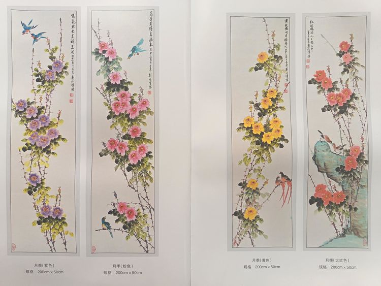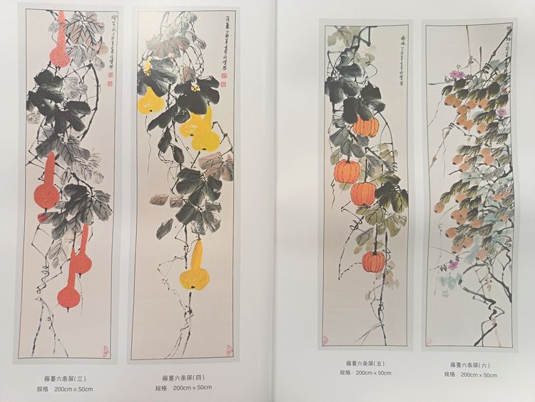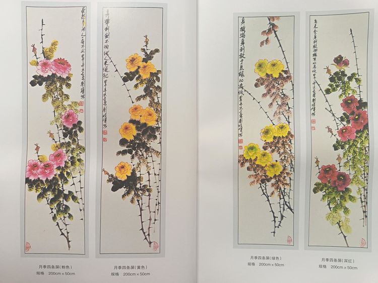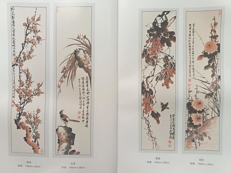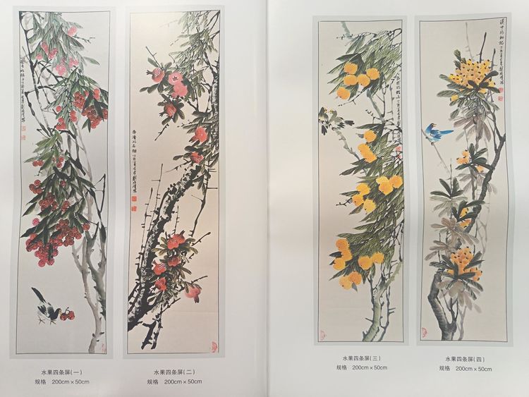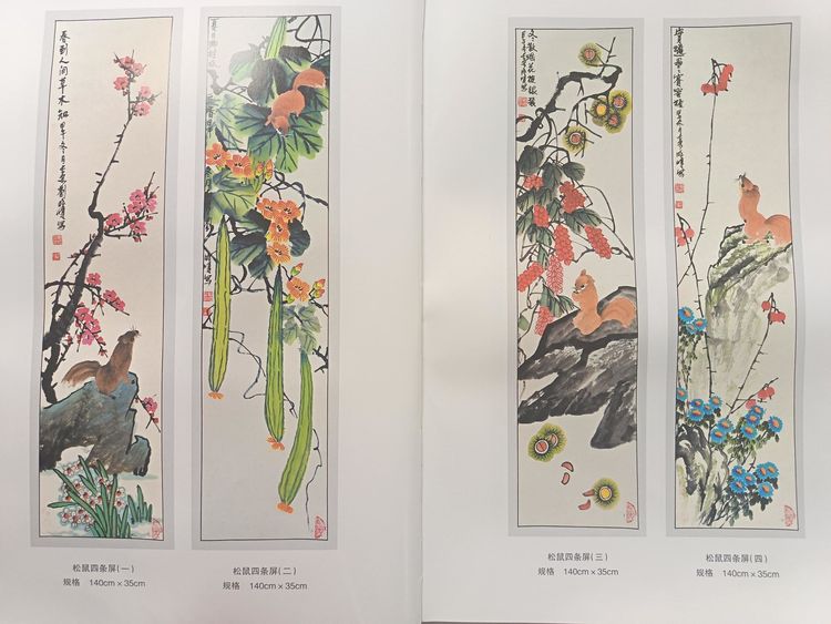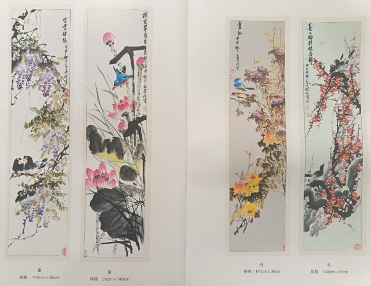 除了震撼人心的长卷作品,刘晓贤的条屏系列同样堪称佳作。6尺对开12条屏《百花齐放》,将四季花卉的千姿百态尽数展现,春梅的傲骨、夏荷的清雅、秋菊的隐逸、冬梅的坚韧,在笔墨流转间次第绽放,仿佛能嗅到花香满溢,听见蜂蝶嗡鸣;《陕西的水果8条屏》与《陕西的鸟8条屏》则充满浓郁的地域风情,石榴的饱满、苹果的圆润、柿子的红火,配以朱鹮的翩跹、喜鹊的灵动、百灵的娇俏,既是对家乡风物的深情礼赞,也是对自然生灵的诗意描摹;而多套春夏秋冬4条屏,更是以凝练的笔墨捕捉四季更迭的神韵,春之明媚、夏之繁茂、秋之绚烂、冬之静谧,皆在尺幅之间流转,尽显艺术家对生活的敏锐洞察与对笔墨的娴熟掌控。