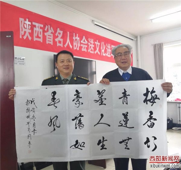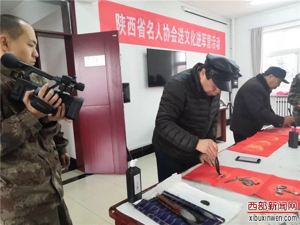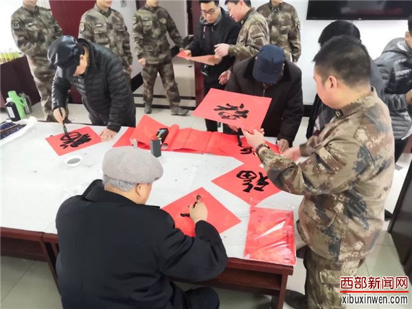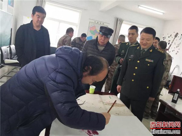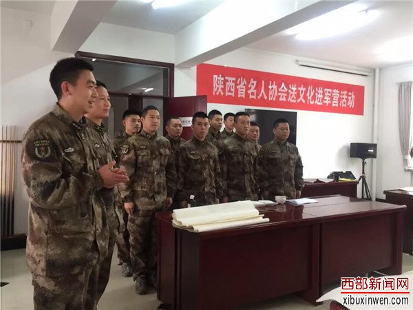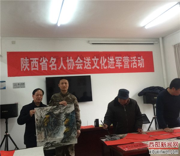 1月29日,大爱寒冬暖、军民情意浓,正值传统节日新年来临之际,陕西省名人协会秘书长王树潮、协会少工委副主任卞正华,带领陕西省著名人物档案协会的会员代表刘平(西安市公安局原局长),郭政强(安康军分区政委)著名书画家李乐见以及韩城市文联主席樊君峰带领的韩城美协副主席王继江、薛增勤、老年书画学会党支部书记吴邦学、会长李岳民、副会长孙选民同省名人协会杂志社冯家敏,翟刘玲一起来到军营现场。现场为官兵挥毫泼墨,送上新春祝福。韩城市神龍矿业有限責任公司全程给予资助。