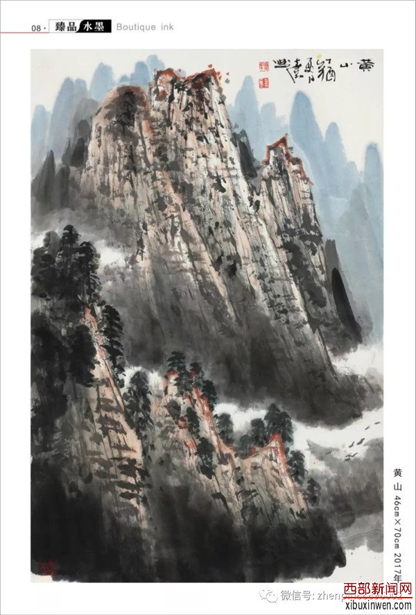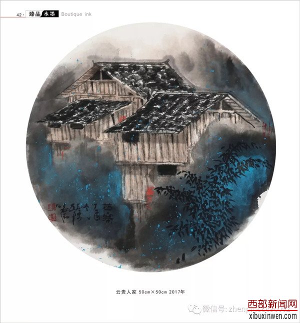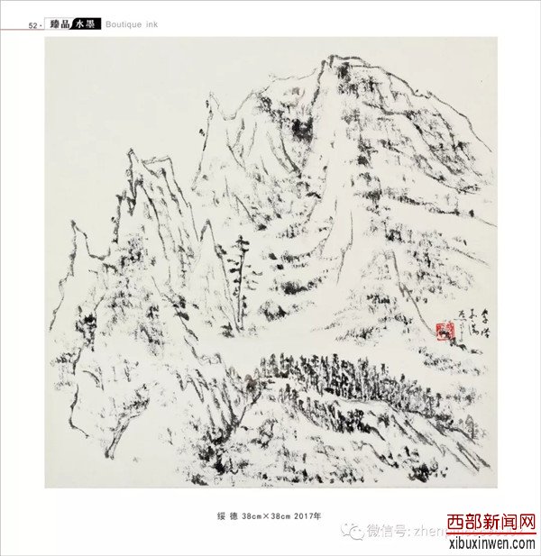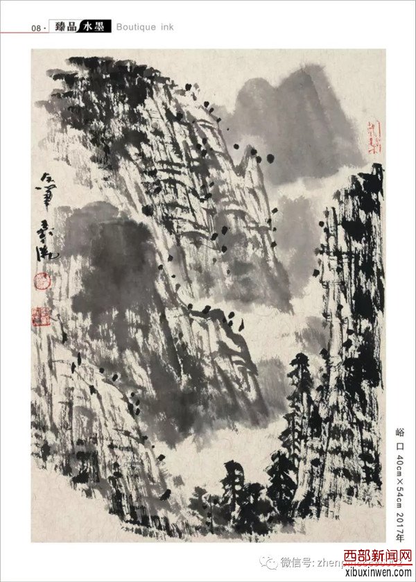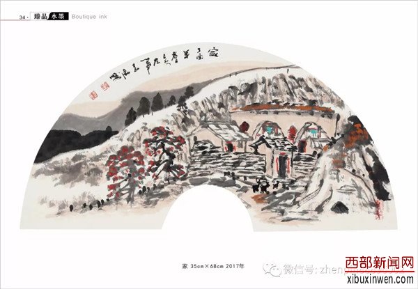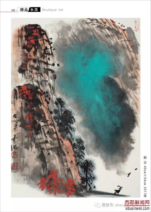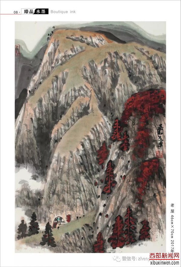 他作品在表现黄土高原为主的同时,也表现秦岭、太行、巴蜀等山系。他描绘的陕北犷莽无垠的黄土高原,贫瘠的山梁沟壑,一排排挂着红辣椒的窑洞……一股粗犷苍凉的气息扑面而来,心底久违的激情猛然迸发,让人瞬间明白,这厚重的黄土孕育的千年文脉,余音仿佛就在耳畔回响,他的脉搏依旧在生生不息的跳动。像一位饱经沧桑的老者,娓娓讲述着过去的故事,也像少年,我们可以感受到他蓬勃的朝气。这就是他的绘画,那放而不野,雄而不浮,朴实、扎实、厚实,传统中见新意,笔墨中见功夫的独特风格,给人传递的力量和魅力。