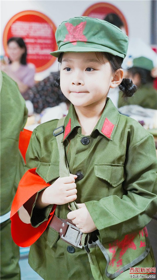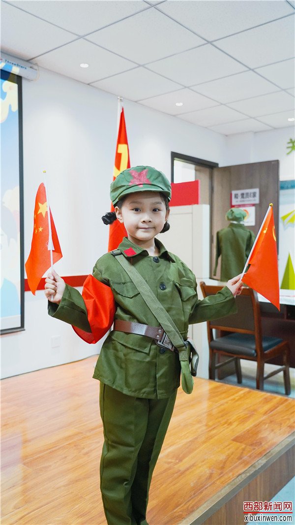 随后,孩子们身穿红军装,戴着自己亲手绘制的红军帽和红军包,一起学习了“八一建军节”的历史意义并认识了军徽和军旗。