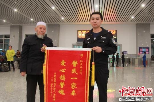 冶廷孝老人为表达对第十三师红星派出所全体干警的谢意,特送上一面锦旗,并与红星派出所民警阿卜杜萨拉木·阿克伯在哈密火车站合影留念。