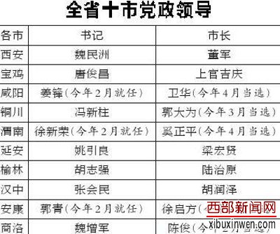 西部新闻网讯 今年以来,咸阳、渭南、安康三市市委书记进行调整;咸阳、铜川、渭南、安康、商洛,共5个市市长“转正”,同时出现两名女市长。