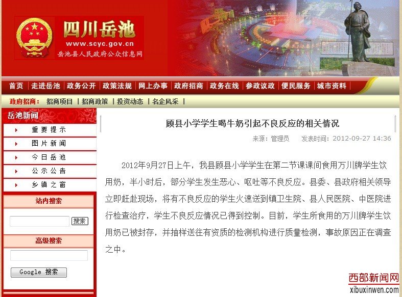 岳池县政府公众信息网发布情况说明称,顾县小学在第二节课间给学生发放了名为“万川牌”的牛奶。有部份学生在喝完牛奶的半小时后,出现了恶心、呕吐等不良反应。