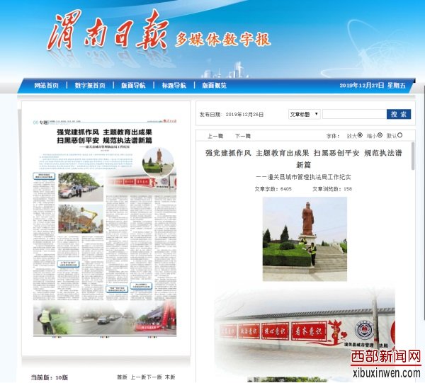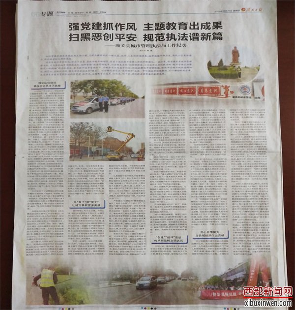 2019年12月26日,渭南日报以“强党建抓作风 主题教育出成果 扫黑恶创平安 规范执法谱新篇”为主题,对潼关城管一年来是如何“不忘初心、牢记使命”扎实开展城市管理各项工作进行了整版专题报道。