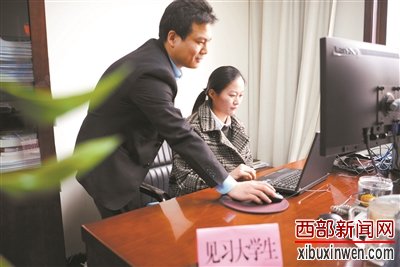 上图:陕西师范大学研究生岳攀(右)接受陕西省政府办公厅工作人员的培训指导。 下图:参加寒假见习的大学生参观陕西省人民政府办公楼。