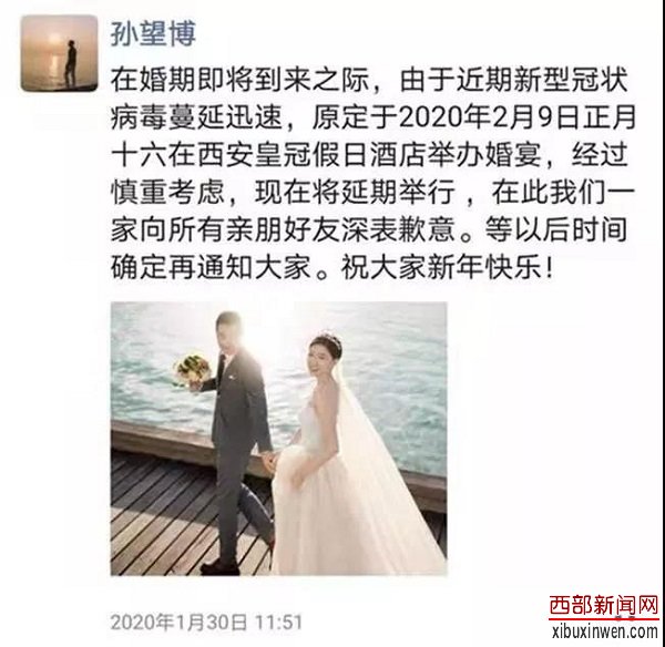 “在婚期即将到来之际,由于近期新型冠状病毒蔓延迅速,原定于2020年2月9日正月十六在西安皇冠假日酒店举办婚宴,经过慎重考虑,现在将延期举行,在此我们一家向所有亲朋好友深表歉意。等以后时间确定再通知大家。祝大家新年快乐!”这是1月30日,汉中市留坝县公安局刑侦大队民警、马道镇龚家院村驻村第一书记兼工作队长孙望博发的一条朋友圈。