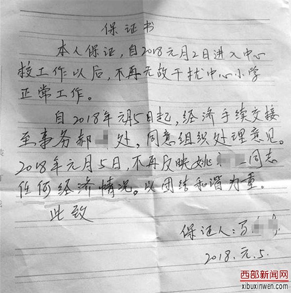 马校长还出示了一份《黄良中心学校关于马老师反映姚某工作问题调解经过》:“……姚校长认识到自己工作中存在违规现象,给中心校写出深刻检讨,并将违规款项清还;姚校长清理与马某债务;此事调解完,马老师写出书面保证不再反映姚校长任何经济问题,以团结和谐为重”。马老师写的《保证书》这样说:“2018年元月5日,不再反应姚校长任何经济情况,以团结和谐为重”。随后,被马校长请来的被举报者中心小学姚校长说:我2017年初进入该校工作,这次被马老师举报“纯属陷害”,我是以个人的名义请学校领导班子去青海旅游,同年10月26日,在校委会上我以清还公款的方式把包括这7500元的12000元款项归还学校新任事务手里。姚校长承认少给上级上缴7500元培训费的错误,愿意接受教育局的处分。