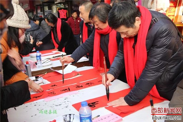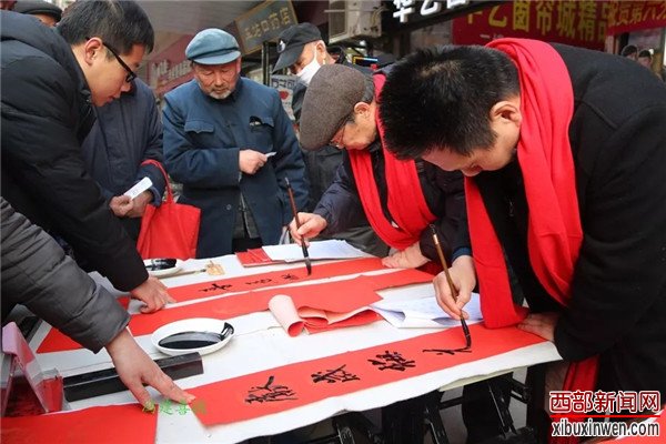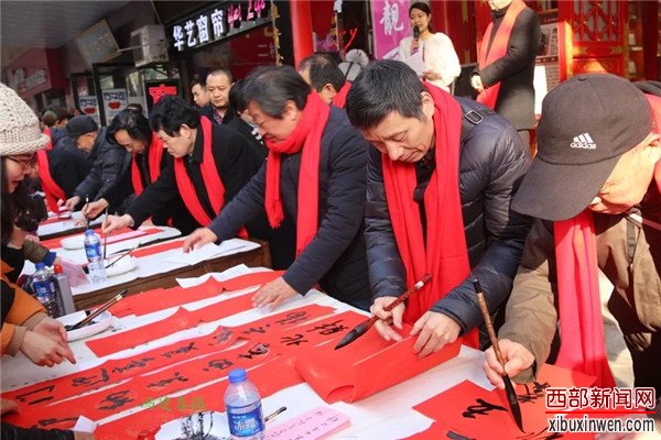 西部新闻网讯 2018年1月3日上午,宝鸡市金台区中山路北京同仁堂宝鸡店门前,书香四溢,人头攒动。陕西省书法家协会副主席李平逊;省书法家协会副主席、宝鸡市书法家协会主席李晔;陕西省书法家协会驻会副秘书长田选军;省书法家协会会员、西安同仁书画院副院长张龙章;省书法家协会会员、宝鸡市职工书协主席杨墨等书法名家冒着零下5度的严寒,现场挥毫泼墨、书写精品春联送祝福,受到居民们的交口称赞!这是省书法家协会联合北京同仁堂宝鸡店为宝鸡市社区群众营造喜庆热烈、欢乐祥和、兴旺红火的节日氛围而举办的“迎新春写春联送祝福文化惠民”活动。
