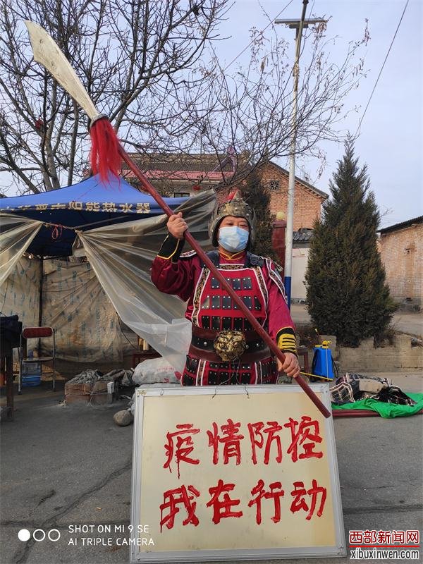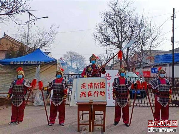 当前新型冠状病毒非常严峻,希望广大群众认清形势,听党话,跟党走,众志成城抗击疫情……”陇县东风镇峪头村的“防疫宣传队”,身着社火服饰,带着小喇叭,边摆造型喊。