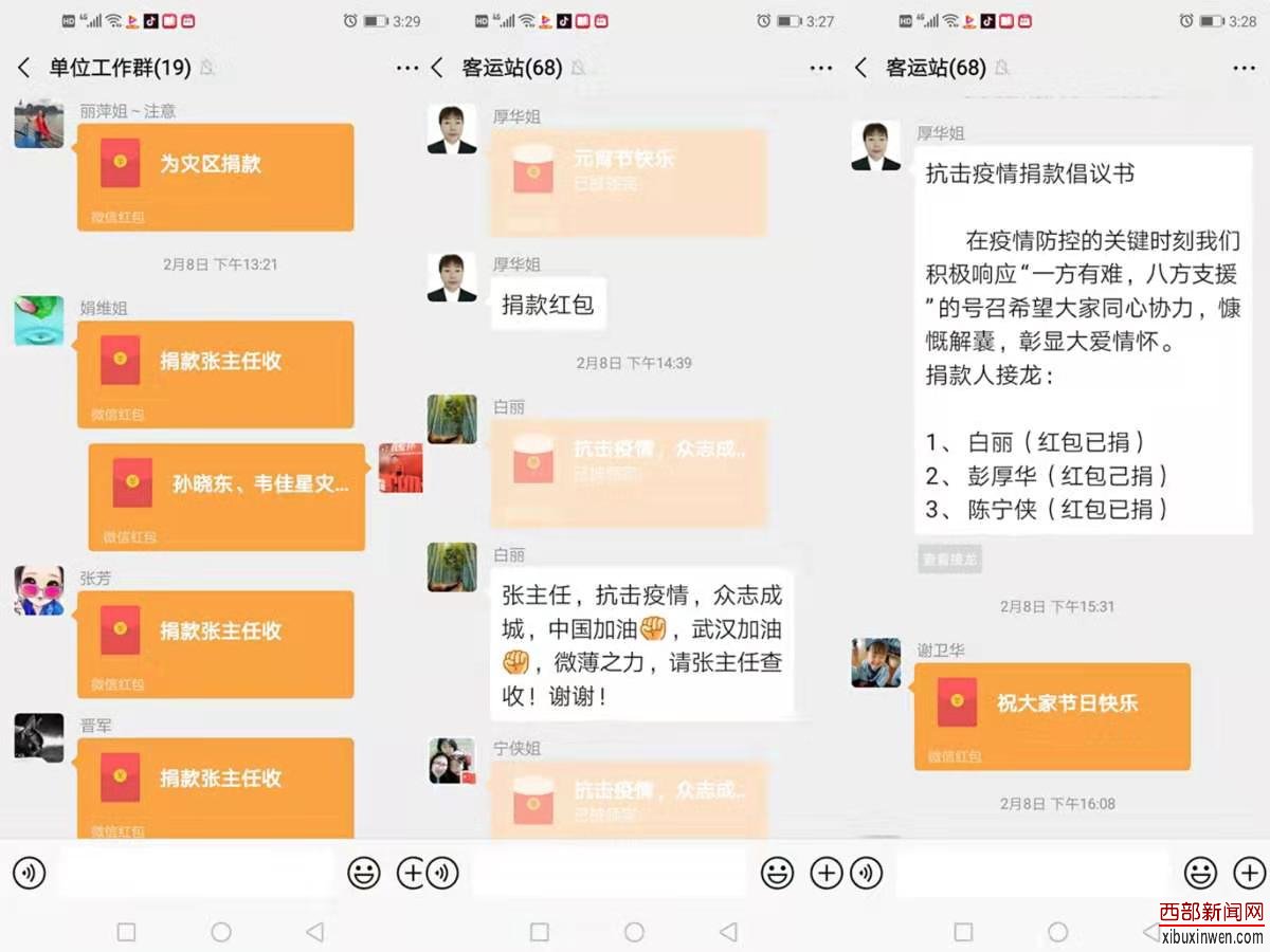 面对疫情,客运总站37名在岗干部职工无一例外全部参与,踊跃捐款,另外还有10名长期请假不在岗的职工看到微信群里的倡议书,也纷纷通过微信转账、发红包的形式,慷慨解囊,奉献爱心,以实际行动驰援疫情防控一线。可能这笔捐款,在所有捐款捐物的大军中,犹如沧海一粟,但每一分钱,都是血浓于水的情谊。