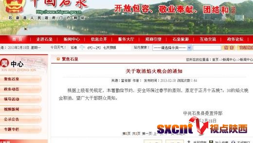 随后,中共石泉县委宣传部2月18日又在该县政府官方网站上发布了《关于取消焰火晚会的通知》:根据上级有关规定,本着勤俭节约、安全环保过春节的原则,原定于正月十五晚7:30的焰火晚会取消,望广大干部群众周知。