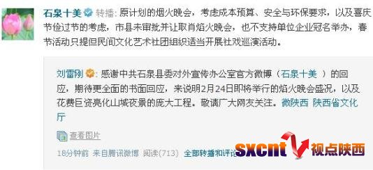石泉县对外宣传办公室即时回应网友微博并告知公众:“原计划的烟火晚会,考虑成本预算、安全与环保要求,以及喜庆节俭过节的考虑,市县未审批并让取消焰火晚会,也不支持单位企业冠名举办,春节活动只提但民间文化艺术社团组织适当开展社戏巡演活动。”