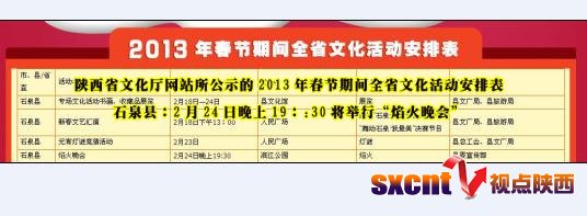 近日,有网友发现陕西省文化厅发布的“2013年春节期间重大文化活动安排表”中,由中共石泉县委宣传部主办的“焰火晚会”将于2月24日晚举行,而安康石泉县正是国家级贫困县,此次举行焰火晚会,又要将多少资金放到天上?