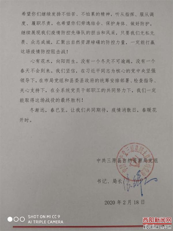 一场突如其来的疫情,让2020年春节变得不同寻常,你们在极易自身感染的情况下,以挺身而出、毫不退缩、战之必胜的勇气和信念,闻令而动、义无反顾的投身到这场疫情阻击战中,在次,请允许我代表中共三原县自然资源局党组向你们致以最真诚的问候、最衷心的感谢和最崇高的敬意,由衷地向你们说一声:大家辛苦啦!