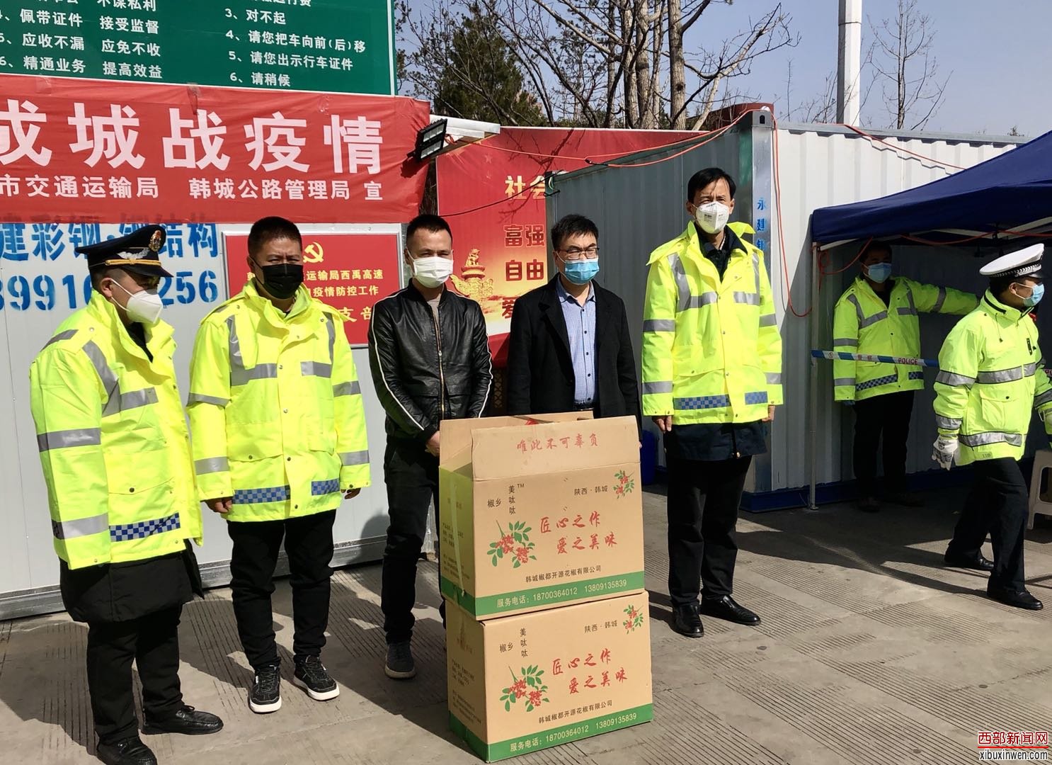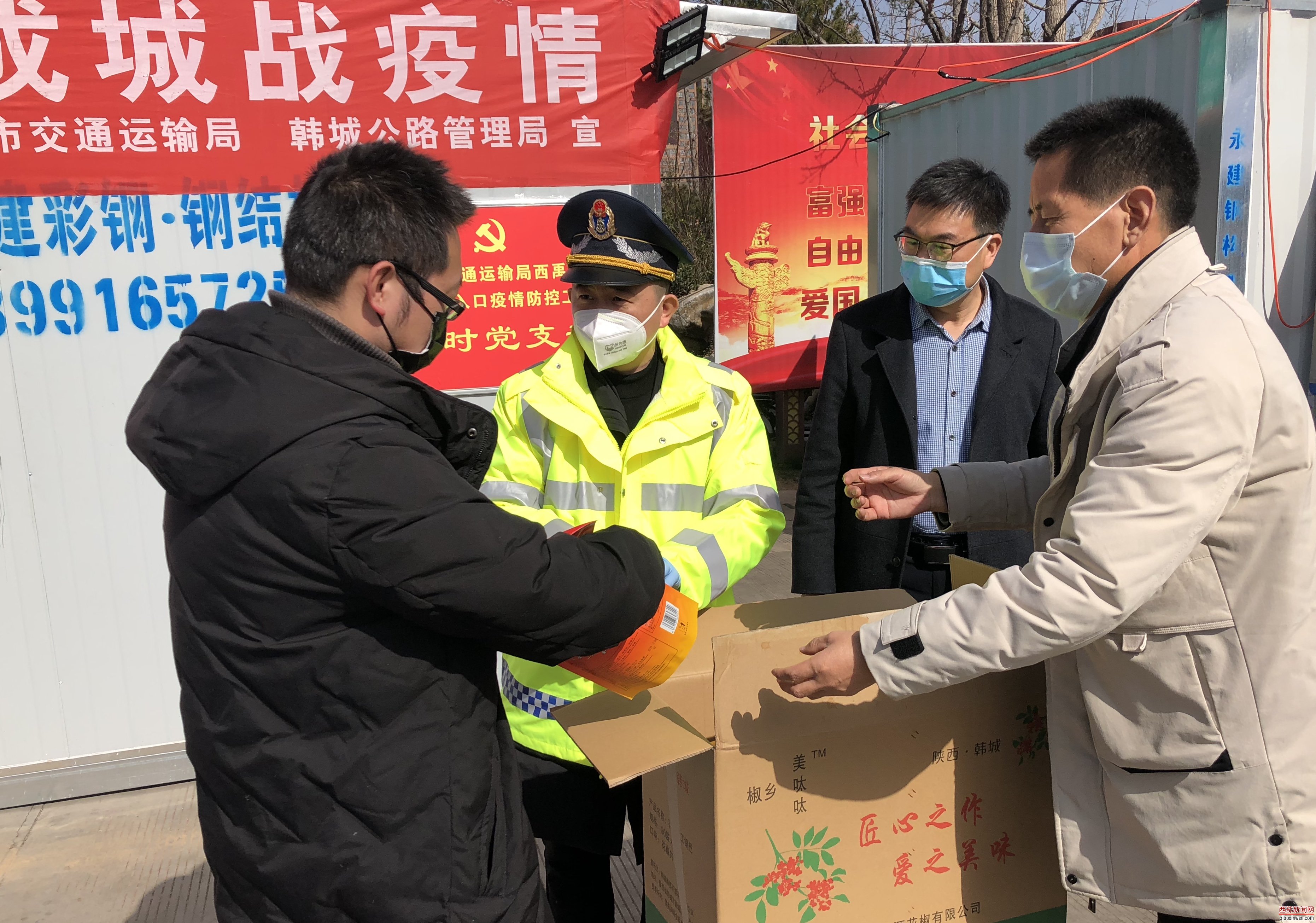 “你好,我想通过西禹高速出入口疫情防控工作临时党支部为奋战在一线的防疫工作人员捐一点物资。”说话的就是返乡自主创业青年薛鹏君,2月21日,他主动联系到市交通运输局西禹高速出入口疫情防控工作临时党支部,为奋战在韩城西禹高速出入疫情防控监测一线的工作人员送去花椒手工锅巴两箱100袋、价值1000元的疫情防控生活物资,这是他继2月5日为板桥镇和共裕村委会、黄龙等防疫检查点守卫人员捐赠花椒手工锅巴15箱450袋、花椒油及麻辣油5箱价值5600余元之后再一次拿出仅有的两箱锅巴捐赠爱心,贡献了一份青年力量。