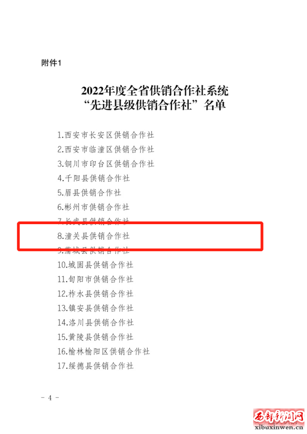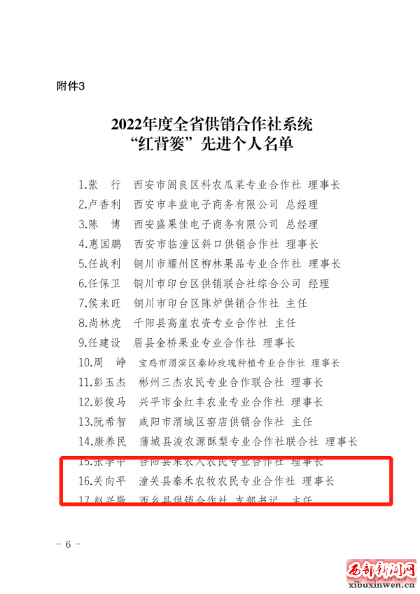 近日,从省供销社传来喜讯,潼关县供销联社荣获2022年度全省供销系统“先进县级供销合作社”,潼关县秦禾农民专业合作社理事长关向平荣获2022年度全省供销系统“红背篓”先进个人。