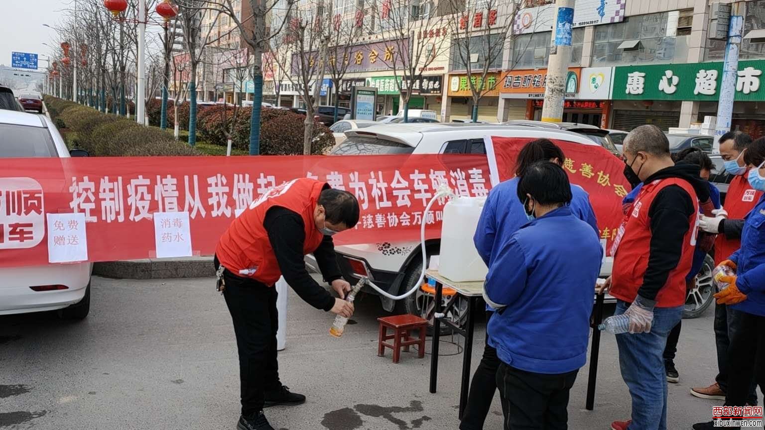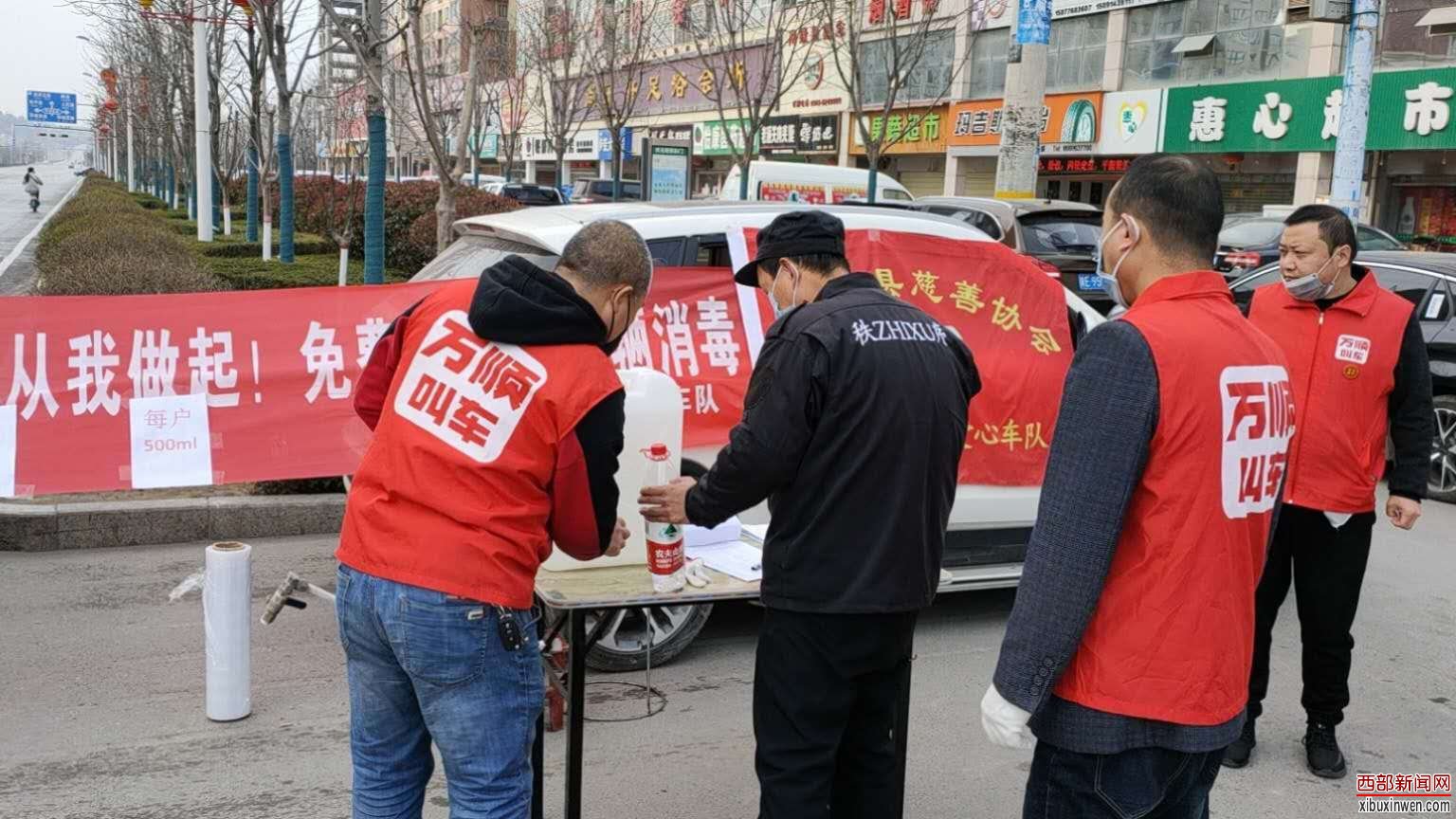 新型冠状病毒肺炎疫情发生以来,富平县街头, 由网约车平台万顺叫车富平服务中心设立的爱心消毒站和他们身着红色马夹的志愿者身影特别引人注目。
