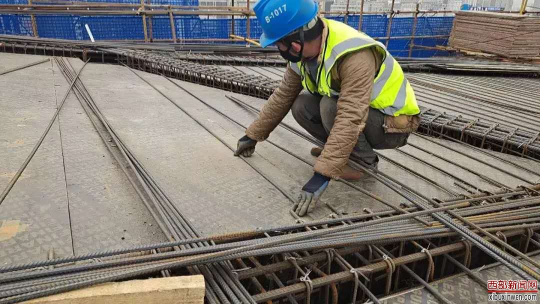 现场工人全部佩戴着口罩。除了正在进行中的展览馆钢结构焊接以外,现场工作还包括博物馆、图书馆主体结构的模板支设、钢筋绑扎以及混凝土浇筑等。