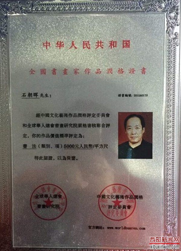 石朝晖书法作品润格证书