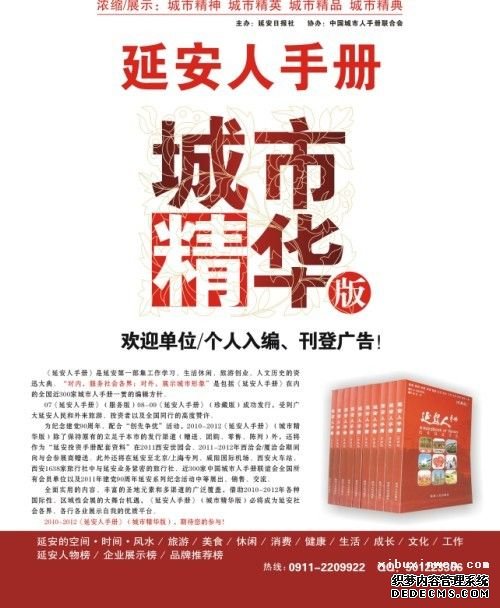 全面实用的内容、丰富的圣地元素和多渠道的广泛覆盖,借助2010~2012年各种国际性、区域性会展的大舞台机遇,《延安人手册》(城市精华版)必将成为延安社会各界、各行各业展示自我的优质平台。