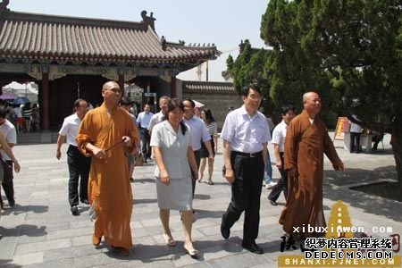 传相法师带领田进副局长一行先后参观了寺院大雄宝殿、般若堂、大遍觉堂、光明堂等,并向大家详细地介绍了大慈恩寺的历史文化和玄奘法师不畏坚辛西行求法的伟大事迹,以及增勤法师自升任方丈以来对恢复祖庭和寺院建设方面所做的贡献等。田局长对传相法师等人的热情接待与详细讲解表示感谢,说大慈恩寺干净整洁,清静幽雅,实乃闹市中的一片净土。