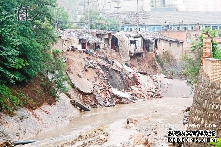 昨日下午,记者赶到事发地,发生灾情的区域已被封锁,家家户户门窗紧闭。在现场进行看护的工作人员带领记者来到一户人家窗外,打开窗户后记者看到,屋内一半已经垮塌,地上凌乱地堆放着一些物品,床等物件都不见了踪影,透过窗户,可以直接看到下边的漆水河。