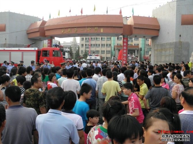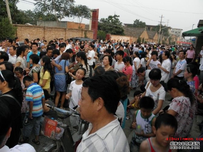 下午5时许,记者闻讯赶到现场,学校门前长约800米的大街被前来观看演出的群众围得水泄不通,许多群众手持“门票”也被警方告知不得进入。在学校大门口记者看到,学校紧锁的自动大门外,一辆消防车封堵着大门口,消防车前警方拉起警戒线依次排开形成“人墙”戒备,警戒线外1米处,消防兵排队阻挡围观群众,人群还数次冲破安全防线进入大门,现场一度失控,混乱不堪。一位戴墨镜的干警见状用话筒向人群喊话,请求群众离开现场。他说,现在进去也看不见,(学校)里边的群众想出也出不来。他带头向人群敬礼致歉。记者现场看到副县长、公安局长刘鹏,县委常委、政法委书记张向阳现场指挥。