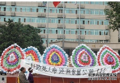 死者家属在医院大门口拉起了横幅摆放了花圈希望讨回公道