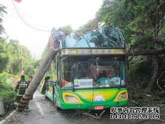 一輛載著大陸觀光客的遊覽車,昨天往慈湖的上坡路段被突然傾斜的電桿、樹木砸中。 (责任编辑:洋洋)