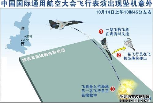 14日上午,2011中国国际通用航空大会在陕西省蒲城县内府机场举行飞行表演时出现意外。现场航展工作人员向西部新闻网记者确认,一架飞豹飞机坠落,记者看到有人在飞机坠落前弹出。