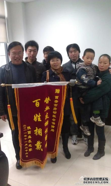 (图1: 西安劳动和社会保障局医保处吴处长接受西安市血友病部分患者和家属锦旗)