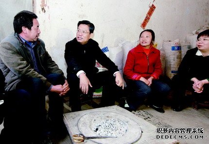 赵乐际首先来到石瓮镇胜利村一组,与熊听贵亲切交谈,“家里几口人?”“六口人,大儿子分家后外出打工,小儿子有智障,小孙女上幼儿园。”“今年(2011年)收成怎样?”“自己种一些,退耕还林补一些,够吃。”“养老金拿到没有?”“每月都能领到50多元。”赵乐际说,“一定要让大儿子安心打工,小孙女好好上学,在各方面的帮助下尽早脱贫致富、过上好日子。”走进王金富家,赵乐际察看屋中堆放的粮食,在厨房揭开盖板看午饭、打开灶火试沼气,他问王金富,“家里收入怎样?”“靠种核桃、板栗和打零工。”“现在最煎熬的是什么?”“两个孩子上学,每周要花120多元,生活还是挺紧。”赵乐际说,一个孩子上职中学技能、一个上初中,国家都有免学费和生活补贴,坚持让他们读书,大孩子工作后家里负担就会减轻。在王金芳家,赵乐际逐项察看墙上“访民情、帮民富”入户调查表,了解她家收入来源和构成,了解到她家小儿子患病时,赵乐际说,孩子的病一刻也不能拖,否则人一辈子不安。要求县上一定要关心帮助,发挥新型农村合作医疗和大病统筹的作用,尽快把孩子的病治好。之后,赵乐际来到胜利村二组看望特困户施光明、吴建英一家。施光明83岁、吴建英76岁,一个儿子去世,两个孙子在外打工。赵乐际询问他们的生活情况,吴建英说,“每月有养老金,还有低保、独生子女费,老伴还有高龄老人补贴,生活没问题。”赵乐际祝两位老人健康长寿,并请村组干部多关心照顾老人的生活。