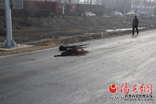 12月20日5时许,在210国道榆林过境线郭家伙场村口十字路口处,一位村民被过往车辆撞击碾轧致死,现场惨不忍睹(过于血腥的位置已作特殊处理)。这是继12月9日、12月14日在210国道连续3人坠桥死亡事故(相关报道见本报12月12日和12月15日1版)后,又一起发生在210国道榆林过境线上的惨剧。