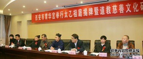 西部新闻网消息:12月21日,古城西安迎来了2011年入冬的第一场雪,“太乙慈善祖庭揭牌仪式暨道教慈善研讨会在曲江池畔的陕西社会主义学院长安雅集大厦隆重举行。该活动由西安市青华宫主办,陕西省道教协会、陕西省社会科学院道学研究中心、西北大学中国节庆文化研究中心、香港道教联合会、香港圆玄学院、香港文汇报、科教网等单位支持协办。有来自道教界、学术界、新闻界、慈善机构以及社会各界知名人士近1000人出席了活动,共同见证全国政协常委、中国道教协会会长任法融题写的“太乙祖庭”、陕西省慈善协会终身名誉会长徐山林题写的“慈善祖庭”揭牌仪式。