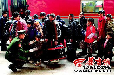 昨日中午12时许,西安火车站,一名武警战士在站台上握住一个小孩的手问:“小妹妹,要回家了,高兴吗?” 华商报记者汤继颖摄