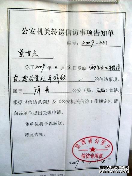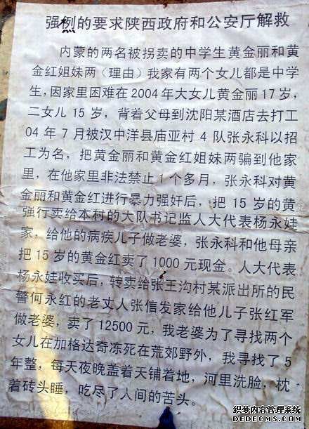 4月9日,署名“老虎庙”的网民在博客中通过文字及视频披露,来自内蒙古的农民黄有杰在西安街头流浪上访,反映陕西洋县的镇人大代表、村支书、公安局长等人拐卖其两个女儿,并将小女儿转来卖去,其间两个女儿遭到强奸、断骨摧残,试图逃跑还遭到公安部门的追捕和殴打。
