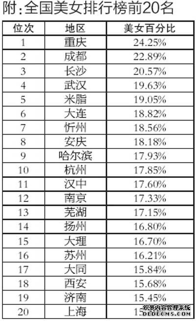 从榜单中看,前20名的排位“专业且详尽”,分为位次、地区、美女百分比、三大指数平均值、所属省市和美女地理划分区等6项。这份列表以美女们的长相、打扮、韵味作为三大指数依据,将全国盛产美女的城市排出了先后。