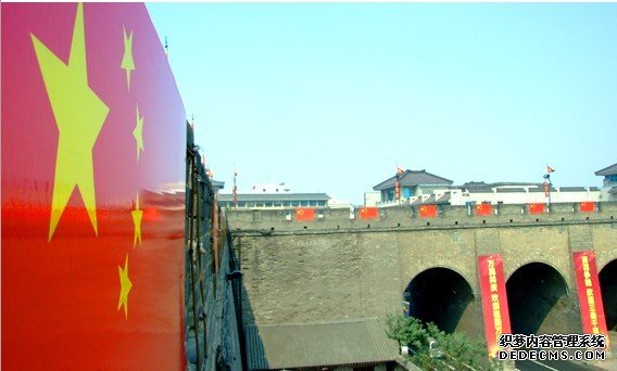西部新闻网消息:在新中国建国60周年和中秋佳节即将到来之际,古城西安用用自己独有的方式给已有3000多年历史的古城披上了节日的盛装。古城西安用8000面国旗装西安城墙,用自己独有的方式给已有600多年历史的古城墙披上了节日的盛装。据了解,今年西安城墙国庆庆典布局由国旗、巨幅标语、花坛和组字灯箱组成,重点烘托古城喜庆、欢乐、祥和的节日气氛。此次悬挂国旗的总面积为1万多平方米,相当于两个足球场的面积,这在西安城墙历史上属首次。
