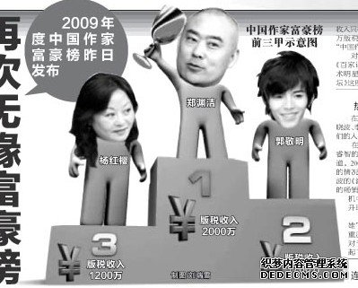 西部新闻网消息:中国作家富豪榜前三甲示意图,昨日,一年一度的“中国作家富豪榜”正式发布。“童话大王”郑渊洁连续4年上榜之后,终于以2000万的版税收入“荣登”榜首;已两次蝉联榜首的郭敬明本次未能卫冕,以1700万版税收入位居第二;儿童文学作家杨红樱则保住了去年第三的位置,版税收入为1200万。