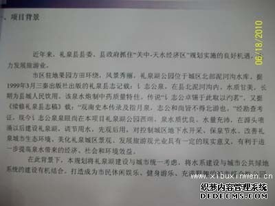 记者组首先来到礼泉县人民政府,在政府大院的规划图里,记者看到了礼泉县政府介绍礼泉县情的图片和文字,其中有关于泥河志公泉的美丽描述。但是,据了解,志公泉早在上个世纪就被沿河企业堆放的垃圾掩埋了,如今具有千年历史和美丽传说的志公泉早已踪迹难觅,被掩埋在垃圾之下。而礼泉县政府还在宣传志公泉,真是极具讽刺意味。 礼泉是全国卫生文明县,但是记者在礼泉看到的却是处处垃圾,卫生条件极差的场面。特别是紧邻县城的泥河,黑水横溢,臭气熏天,垃圾堆积如山。记者在礼泉县政府办公室一位姓李的同志联系下,分别采访了礼泉县环保局和建设局。下午3点,记者组来到礼泉县环保局,在这里见到了礼泉县环保局一个姓杨的局长。杨局长介绍说,关于泥河污水处理问题,2002年县上研究由通达公司投资约2400万元修建了一个污水处理厂,2004年投入使用,当时日处理污水能力1.2万吨,但现在礼泉的污水排放远远大于1.2万吨,所以各项处理指标已达不到国家要求,所以才有大量污水直接流入泥河。杨局长还介绍,由于污水处理厂是通达公司投资修建的,为了弥补该公司的损失,由通达公司接收礼泉自来水公司,成立通达水务公司,收取群众的生活用水费和污水处理费。于是,一个怪现象在礼泉出现了,礼泉县群众每月都要缴纳污水处理费,但是,他们依然还要生活在污水横流,恶臭肆虐的环境中。而礼泉县政府将关系全县民生的自来水供给和污水处理工程,完全交给一家私营公司,也是一件令人匪夷所思的事情。