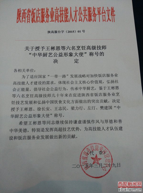 西部美食娱乐网快讯:今日(3月29日)下午,由陕西省饭店服务业高技能人才公共服务平台主办的“中华厨艺公益形象大使授牌暨拜师收徒仪式”3月29日(星期天)下午3时在建国路雍村饭店二楼礼堂举行。