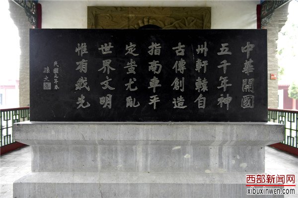 轩辕殿里黄帝神位以浮雕形式刻于大型石材上,立于大殿正中偏北处。以东汉恒帝建和元年建于山东武梁祠的黄帝石刻画像为蓝本,像高4.1米,宽2.92米。一手指向天空,一手置以胸前,侧身向前,似乎在告诉后面的人,随我前行。也显出黄帝的古朴神韵和“一指定乾坤”的神秘与传奇。站立于西侧仰视,黄帝坚毅刚强,似在领导先民奋斗创业;正面仰视,黄帝慈祥亲切、意境高远;东侧仰视,黄帝欣慰自信,似在注视着炎黄子孙和神州大地……当阳光升起,黄帝像像最东南角先受到阳光的照射,然后随着太阳的移动,到了正午时分,阳光正射,整个黄帝像都沐浴在阳光中,形成天、地、阳光共集一身的神奇景象,体现出天圆地方,天人合一的自然景观。