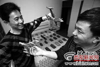 张爱东(右)和自己的战友玩飞机模型 本组图片由本报记者 袁琛 摄